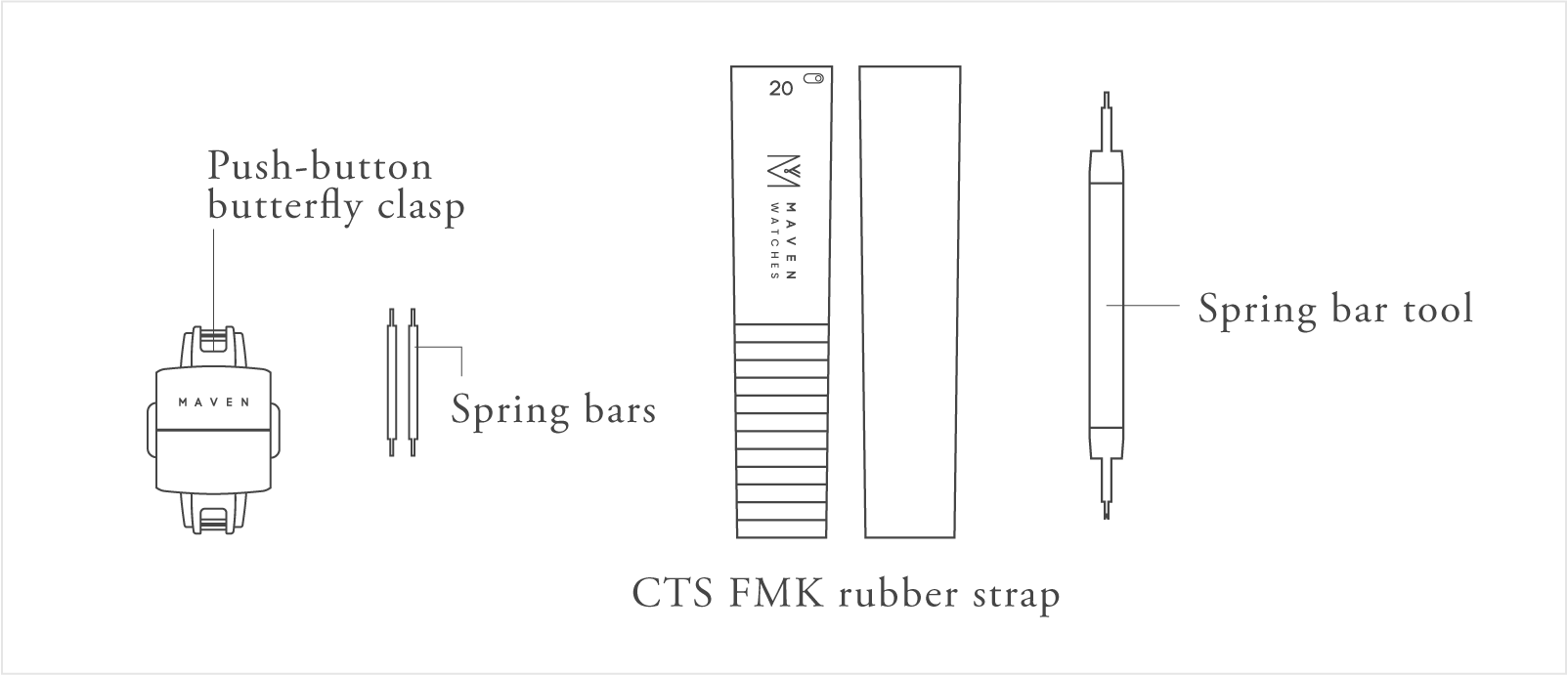 TOOLS REQUIRED FOR INSTALLATION: 1.FKM Rubber Watch Strap (Cut to size) 2.Sharp scissors 3.Spring bars 4.Pin pusher 5.Butterfly clasp 6.Soft mat (Protect the watch face during installation)