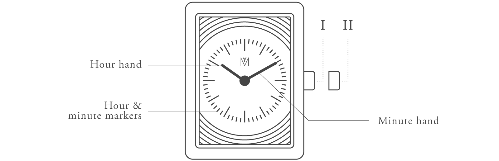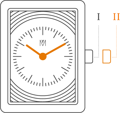 Pull out the crown to position II and turn the crown to set the hour and minute hand. Push the crown back to the position I.
