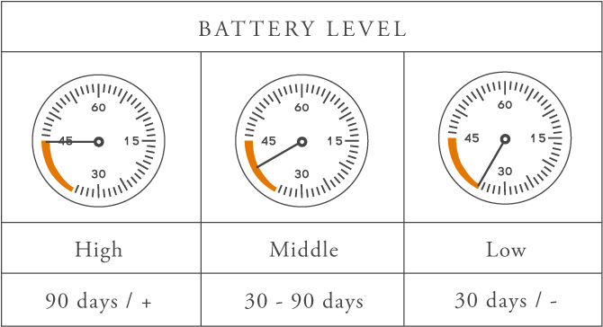 Press button B for 2 seconds to display the current battery level. The small second hand automatically resets after 2 seconds.