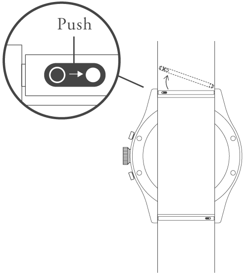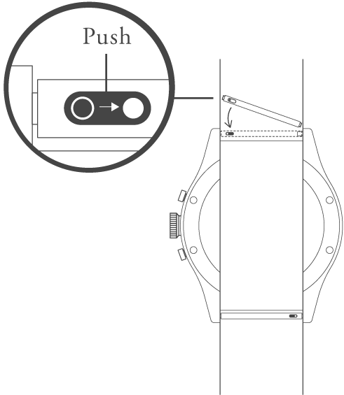 3. Place one end of the spring bar into the lug hole, then insert spring bars by pushing the pin inward. Make sure the spring bars snap into the lug holes.
