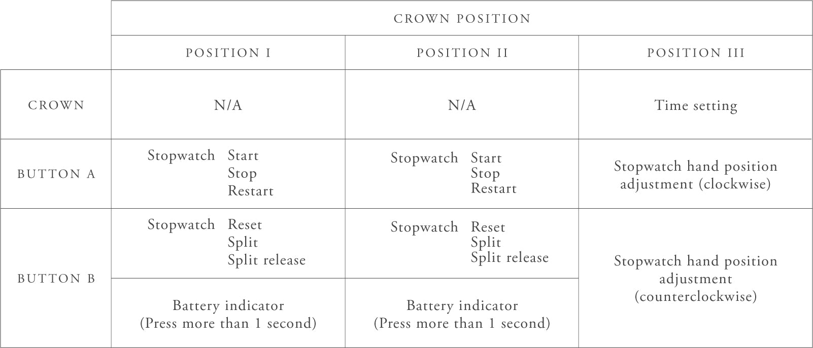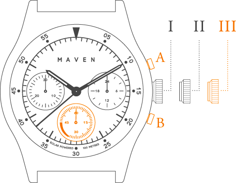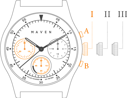 Button B: Counterclockwise move - Push the crown back to the position I.