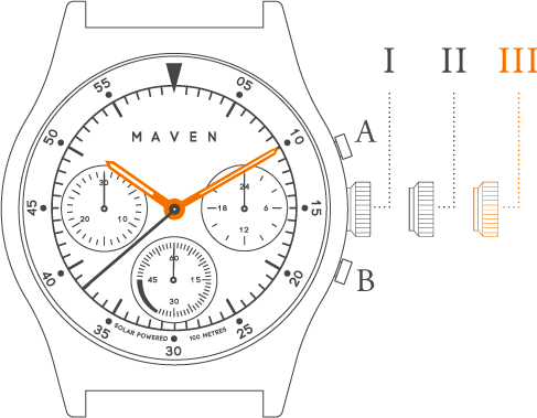 To start, please confirm the crown is set at the position I, the sub-second hand (bottom subdial) is at “60”, and minute subdial hand (left subdial) is at “30”.